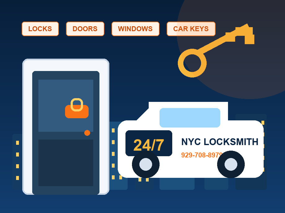 服务皇后区法拉盛、布鲁克林、曼哈顿、布朗克斯、长岛、史丹顿岛等纽约地区。支持紧急开锁、修锁换锁、智能锁安装、汽车芯片钥匙、保险柜开锁、门窗维修等服务。 Serving Queens, Flushing, Brooklyn, Manhattan, Bronx, Long Island, Staten Island and nearby areas. Emergency lockout, lock repair, smart lock installation, car key programming, safe opening, door and window repair.